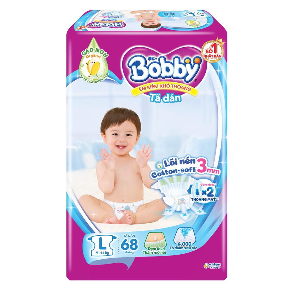 Bỉm tã dán Bobby size L 68 miếng là dòng sản phẩm dành cho bé từ 9-13kg thuộc thương hiệu Bobby đến từ tập đoàn Unicharm Nhật Bản. Tã dán siêu thấm và khô thoáng Bobby mang đến cho bé những giờ phút vui chơi thỏa thích và những giấc ngủ thật sâu và ngon.