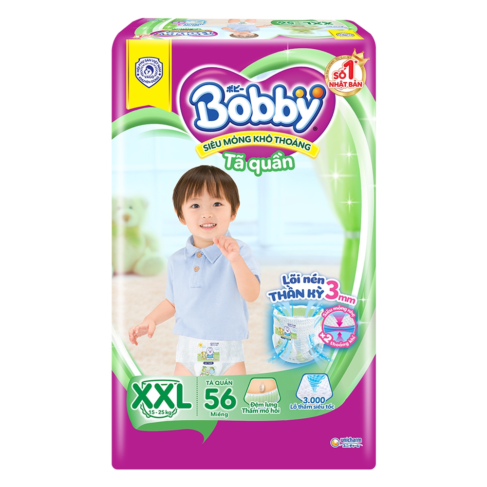 Bỉm tã quần Bobby size XXL 56 miếng là sản phẩm bỉm tã dành cho bé từ 15-25kg thuộc thương hiệu Bobby đến từ tập đoàn Unicharm Nhật Bản. Sản phẩm là sự lựa chọn tốt nhất mà mẹ dành cho bé yêu trong những tháng năm đầu đời.