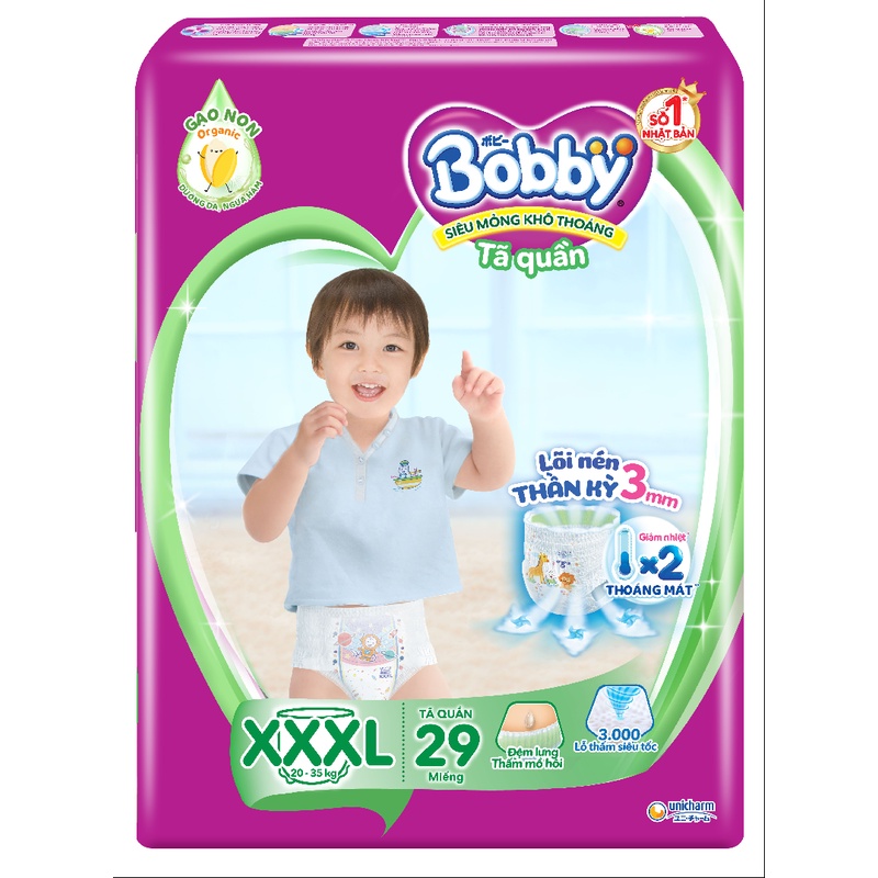 - Tã quần Bobby size XXXL 29 miếng (20 – 35 kg) siêu mỏng nhẹ bởi thiết kế lõi nén chỉ 3 mm giúp bé dễ dàng và thoải mái trong việc di chuyển.
